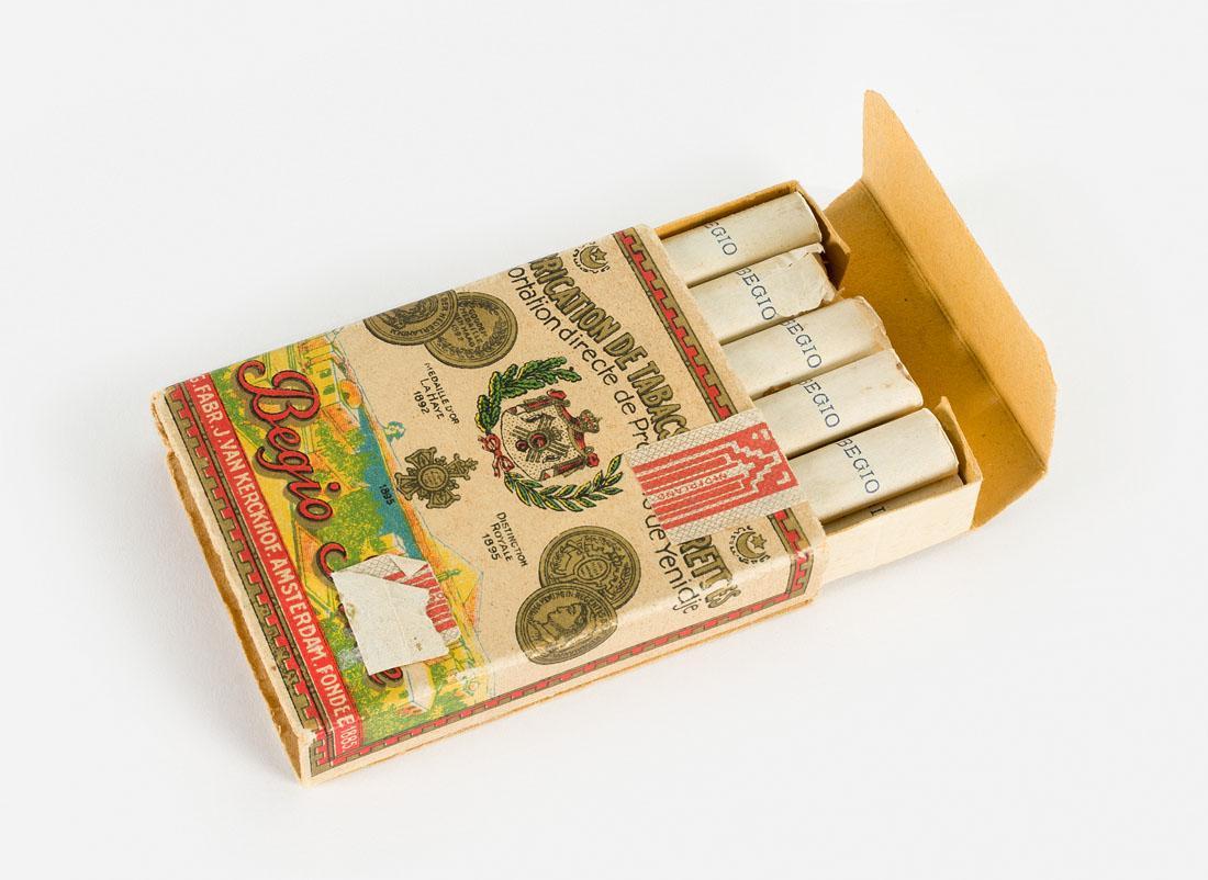 Kartonnen doosje sigaretten van 'Begio Fines'. Het doosje in het midden geïllustreerd met gekroond wapen met lauwertakken geflankeerd door prijsmedailles, o.a. Den Haag 1892. en koninklijke onderscheiding in 1895.