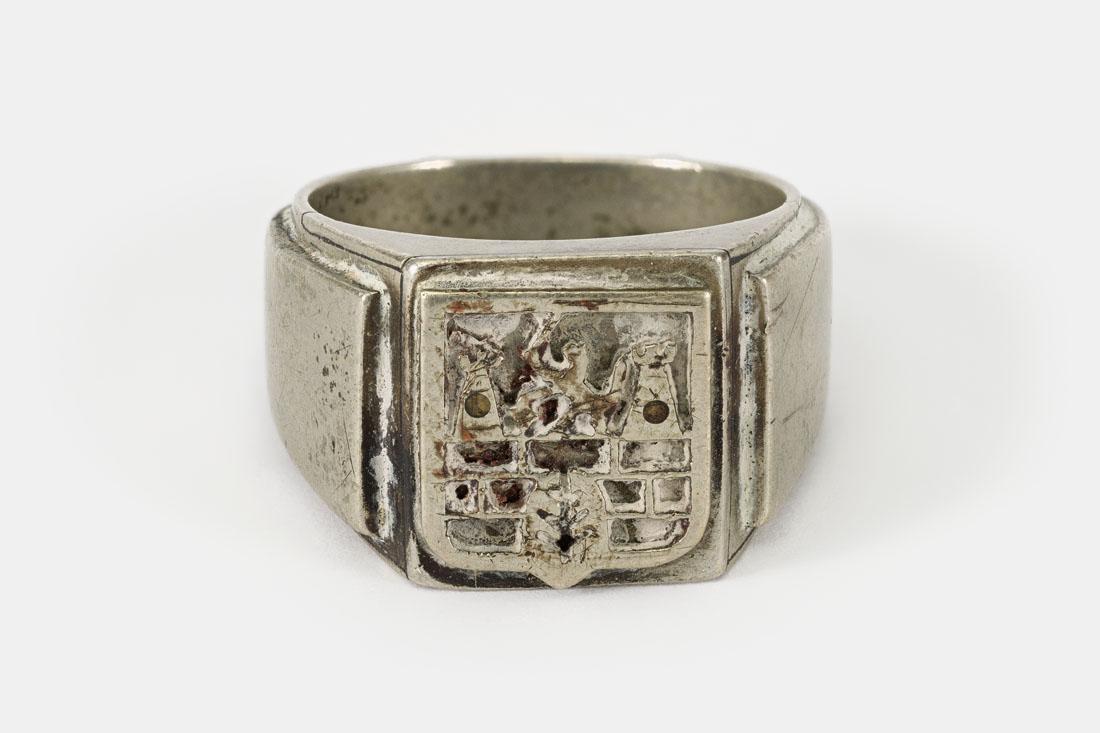 Witmetalen zegelring met wapen van Theresienstadt.