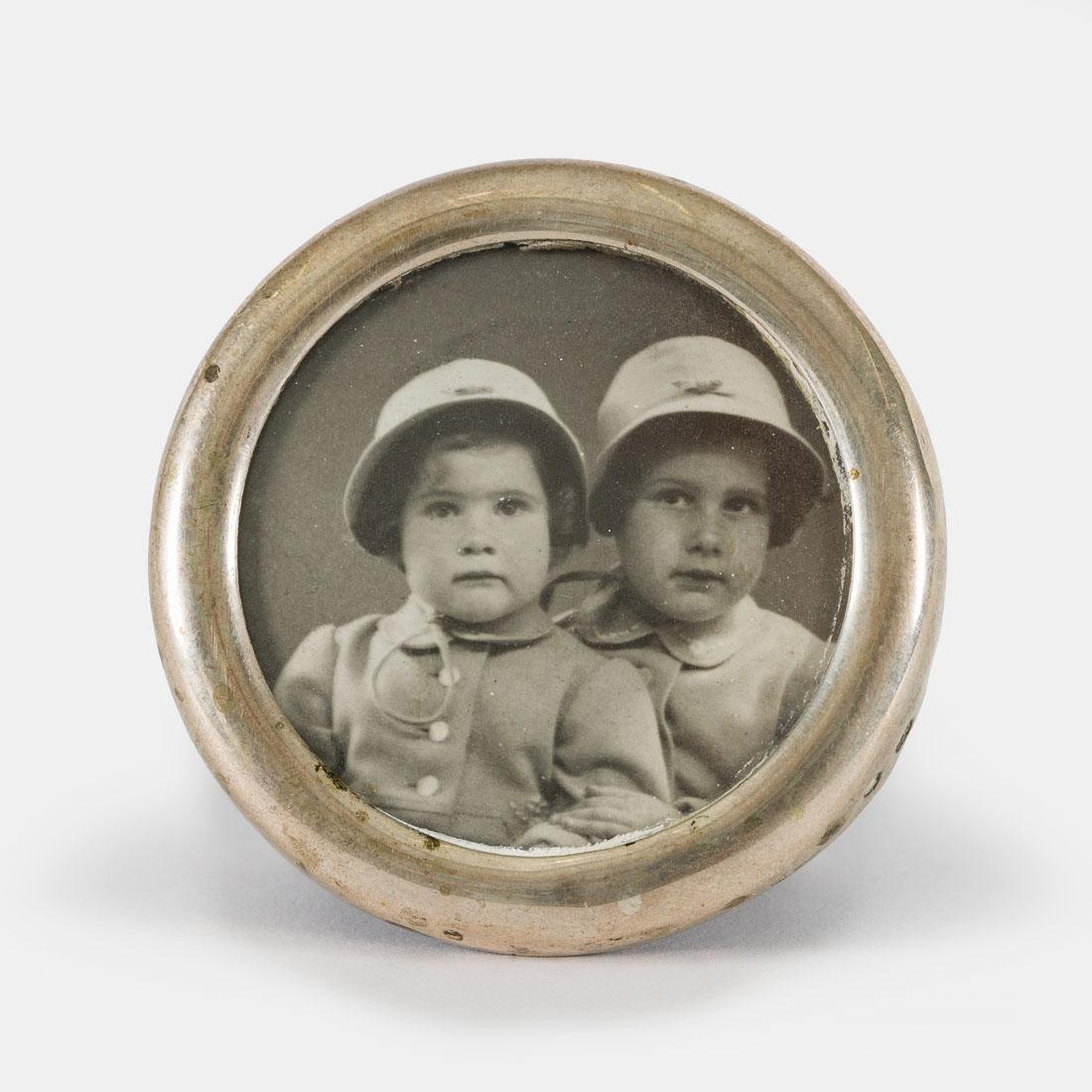 Foto van twee kleine meisjes in een rond lijstje.