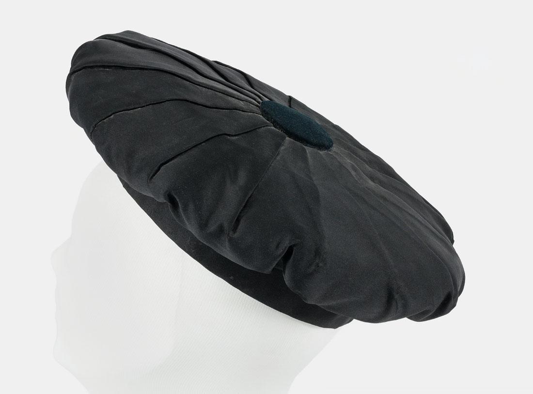 Zwarte baret met leren binnenrand, gedragen door een chazan. In de voering van de baret is een davidster geborduurd.