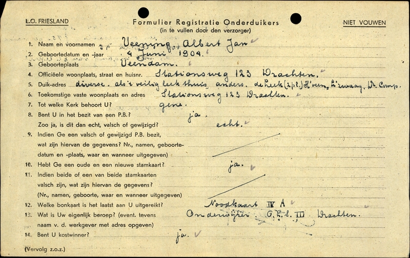 Onderduikinschrijving van Albert Jan Veening