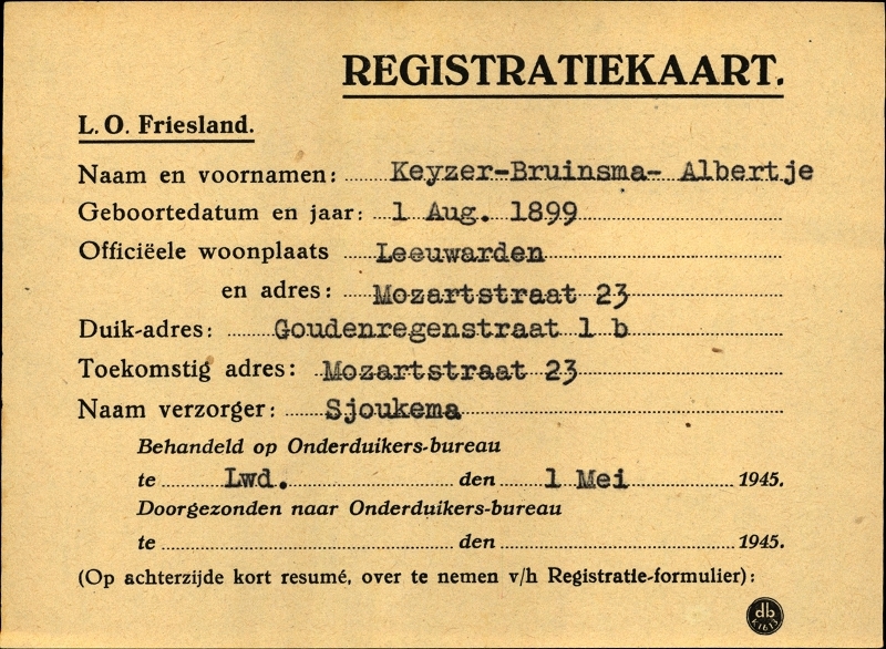 Duikadres: Goudenregenstraat 1 b, - Oorspronkelijk adres: Mozartstraat 23, - Reden onderduik: staking - Overige opmerkingen: Achterkant beroep: huisvrouw