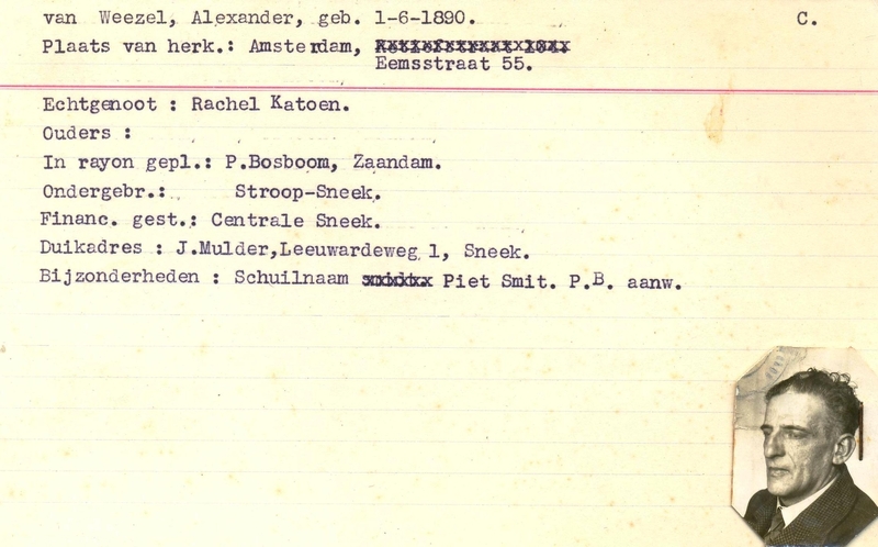Duikadres: Leeuwarderweg 1, Sneek - Oorspronkelijk adres: Eemsstraat 55, Amsterdam - Overige opmerkingen: Bijzonderheden: 'Financ. gest.: Centrale Sneek - (...) Schuilnaam Piet Smit - pb aanwezig' - Met foto