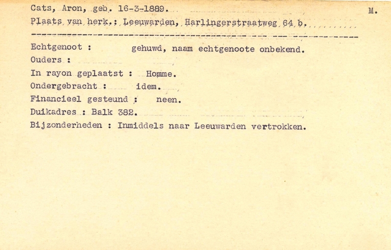 Duikadres: 382, Balk - Oorspronkelijk adres: Harlingerstraatweg 64 b, Leeuwarden - Overige opmerkingen: Bijzonderheden: Inmiddels naar Leeuwarden vertrokken. - Financieel gesteund: neen.