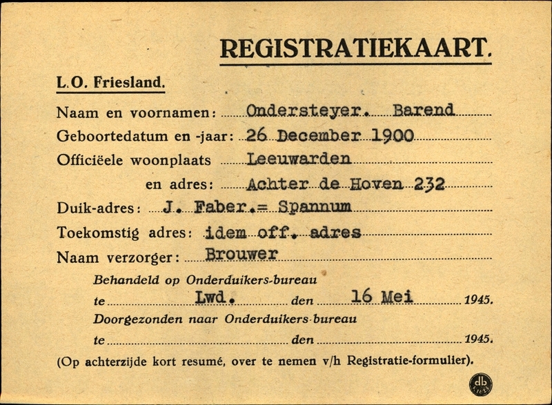 Duikadres: Spannum - Oorspronkelijk adres: Achter de Hoven 232, Leeuwarden - Reden onderduik: arbeidsinzet - Overige opmerkingen: Achterkant bijzonderheden: Goede stkrt. - Achterkant beroep: Waschverzender