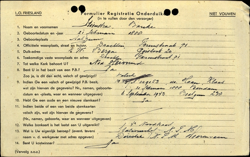 Onderduikinschrijving van Bauke Stienstra