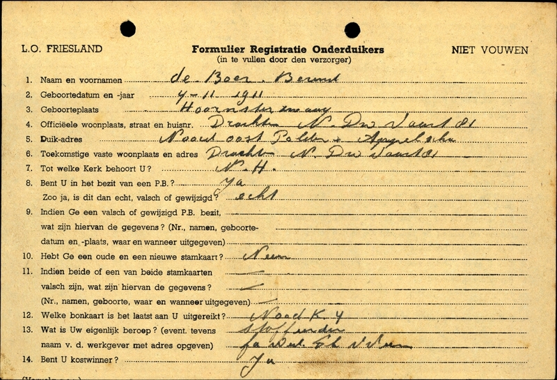 Duikadres: Noordoostpolder - Oorspronkelijk adres: Noorderdwarsvaart 81, Drachten - Reden onderduik: arbeidsinzet