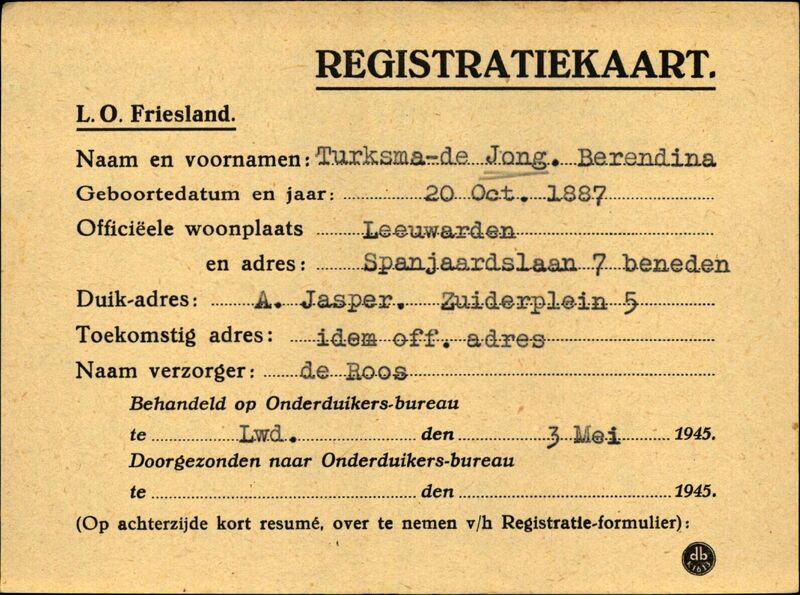 Duikadres: Zuiderplein 5 (A.Jasper), Leeuwarden - Oorspronkelijk adres: Spanjaardslaan 7 beneden, Leeuwarden - Reden onderduik: jodenvervolging - Overige opmerkingen: Achterkant bijzonderheden: Gehuwd met Turksma. - Geen stkrt. - Achterkant beroep: huisvrouw