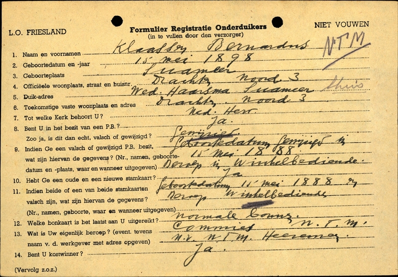 Duikadres: Suameer - Oorspronkelijk adres: Het Noord 3, Drachten - Reden onderduik: staking - Overige opmerkingen: Bijzondere opmerkingen: P.B. gewijzigd: geboortedatum 15-05-1888 en beroep in winkelbediende. - Spoor- en tramwegstaking. Vijand heeft rijwiel en radiotoestel in beslag genomen.