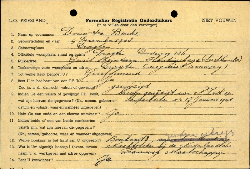 Duikadres: Luchtenveld, Houtigehage - Oorspronkelijk adres: Oudeweg 136, Drachten - Reden onderduik: staking - Overige opmerkingen: Bijzondere opmerkingen: Aangezien de landwacht in het huis is geweest kan ik nog niet precies zeggen wat er is vernield of meegenomen. Ik hoop spoedig een huis te krijgen. - - Bij PB: beiden gewijzigd van NTM op landarbeider op 17 januari 1945. - Met potlood bijgeschreven: ongeregeld steun NTM. hoe kan dat ?