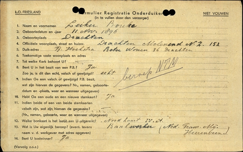 Duikadres: Beter Wonen 36, Drachten - Oorspronkelijk adres: Moleneind Noordzijde 152, Drachten - Reden onderduik: staking - Overige opmerkingen: Bijzondere opmerkingen: Tijdens afwezigheid word het volgende vermist: 1 radiotoestel, 1 Auto accu, 1 Motor accu, 1 radio accu, 1 Volt. Ampere meter, 1 voer brandhout