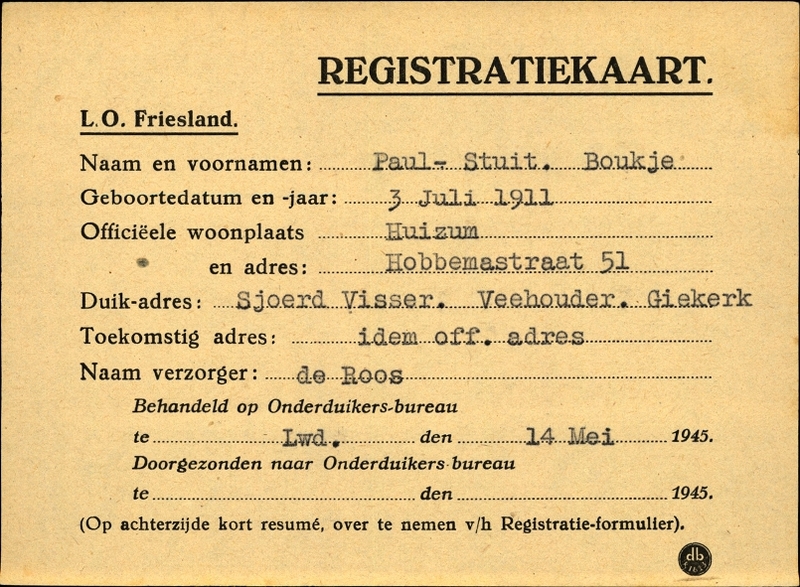 Duikadres: Giekerk - Oorspronkelijk adres: Hobbemastraat 51, Huizum - Reden onderduik: anderszins - Overige opmerkingen: Achterkant bijzonderheden: Naam: Paul - Stuit, Boukje - Duikadres: Sjoerd Visser. Veehouder - Ondergedoken wegens desertie van mijn man - Achterkant beroep: zonder beroep (huisvrouw)