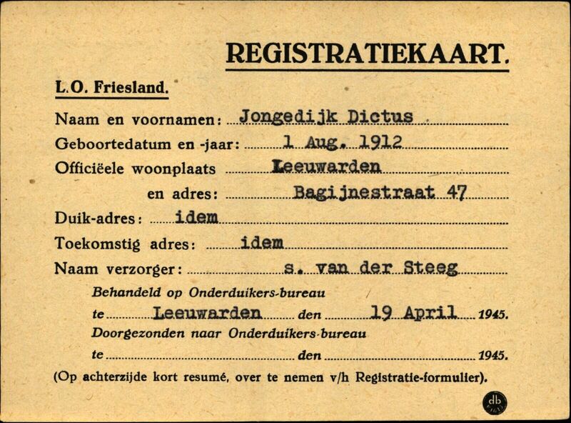 Duikadres: Bagijnestraat 47, Leeuwarden - Oorspronkelijk adres: Bagijnestraat 47, Leeuwarden - Reden onderduik: arbeidsinzet - Overige opmerkingen: Achterkant bijzonderheden: werkloos - Achterkant beroep: metselaar