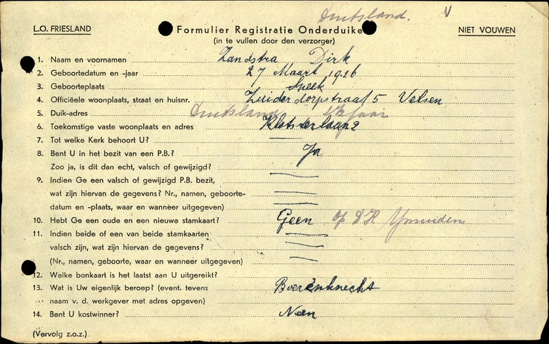 Onderduikinschrijving van Dirk Zandstra