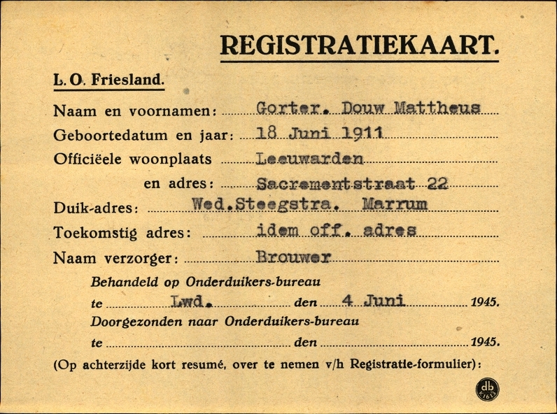 Onderduikinschrijving van Douw Mattheus Gorter
