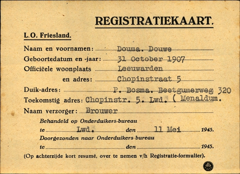 Duikadres: Bitgumerdyk 320, Menaldum - Oorspronkelijk adres: Chopinstraat 5, Leeuwarden - Reden onderduik: krijgsgevangene - Overige opmerkingen: Achterkant beroep: Ambtenaar - Achterkant naam werkgever: Prijzenbureau Onroerende zaken