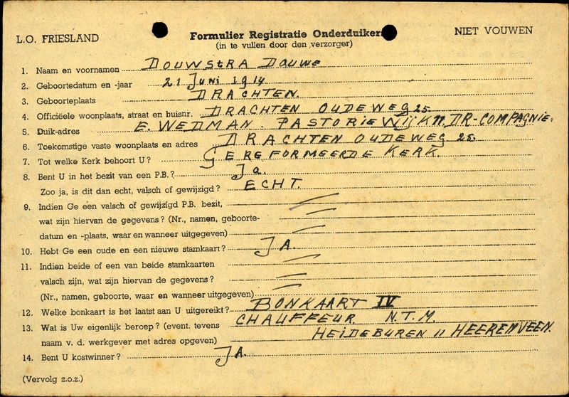 Duikadres: Pastorijwyk 11, Drachtstercompagnie - Oorspronkelijk adres: Oudeweg 25, Drachten - Reden onderduik: staking - Overige opmerkingen: Bijzondere opmerkingen: Betrekking: voorlopig bij de N.B.S. - - Bezittingen: alleen hebben twee moffen meiden, 2 japonnen en kindergoed en garen uit huis gestolen.