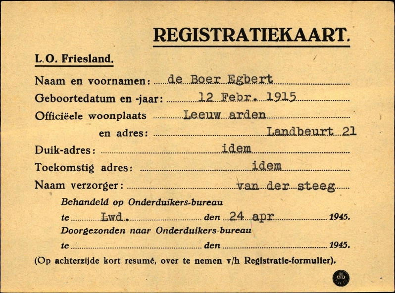 Duikadres: Landbuurt 21, Leeuwarden - Oorspronkelijk adres: Landbuurt 21, Leeuwarden - Reden onderduik: arbeidsinzet - Overige opmerkingen: Achterkant beroep: Chauffeur - Achterkant naam werkgever: -