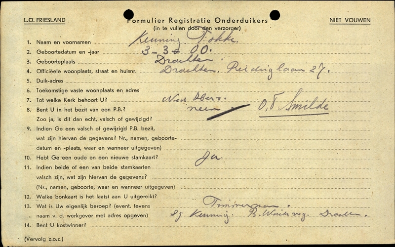 - Oorspronkelijk adres: Reidingweg 27, Drachten - Reden onderduik: arbeidsinzet - Overige opmerkingen: Bijzondere opmerkingen: bij P.B/.: "O.T. Smilde