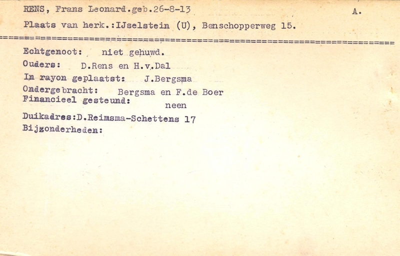 Onderduikinschrijving van Frans Leonard Rens