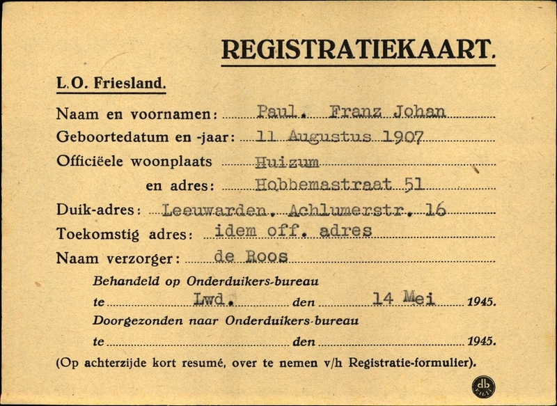 Duikadres: Achlumerstraat 16, Leeuwarden - Oorspronkelijk adres: Hobbemastraat 51, Huizum - Reden onderduik: anderszins - Overige opmerkingen: Achterkant bijzonderheden: Ondergedoken wegens desertie (is geb. in Weenen en werd gedwongen dienst te nemen bij de Duitschers) gevlucht in Sept. 1944 - Toekomstig adres: idem off. adres (Huizum, Hobbemastraat 51) - - Behandeld op Onderduikers-bureau te Lwd. den 14 Mei 1945. - geen stkrt. - Achterkant beroep: werkzaam geweest als Ovenbouwer en fabr. van Bakkerijmachines