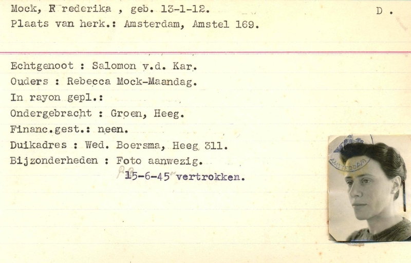 Duikadres: 311, Heeg - Oorspronkelijk adres: Amstel 169, Amsterdam - Overige opmerkingen: Bijzonderheden: Foto aanwezig - 15-6-45 vertrokken