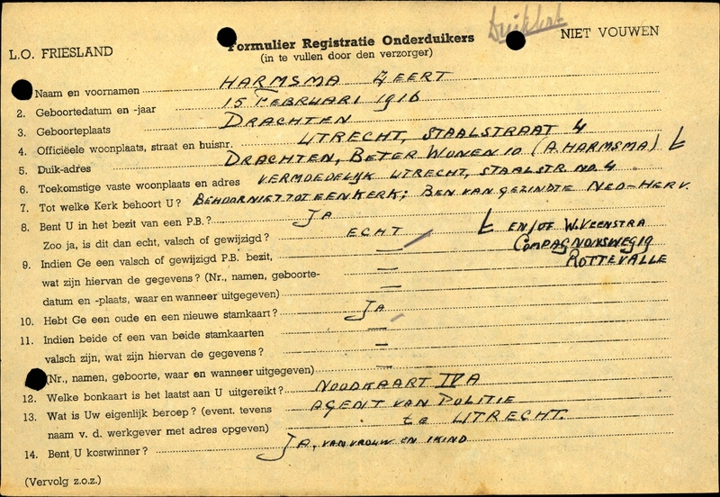 Duikadres: Beter Wonen 10, Drachten - Oorspronkelijk adres: Staalstraat 4, Utrecht - Reden onderduik: anderszins - Overige opmerkingen: Bijzondere opmerkingen: Ondergedoken door de deportatie politieambtenaren en andere personen in Rotterdam en Den Haag o.a. - Tweede onderduikadres: Rottevalle, Compagnonsweg 19 bij W. Veenstra