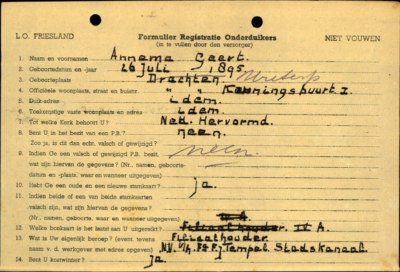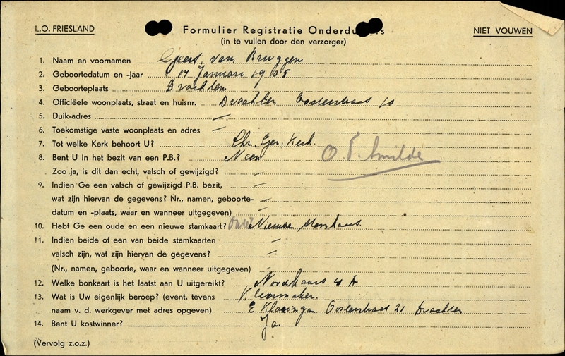 - Oorspronkelijk adres: Oosterstraat 10, Drachten - Reden onderduik: arbeidsinzet - Overige opmerkingen: Bijzondere opmerkingen: PB later toegevoegd: O.T.Smilde?
