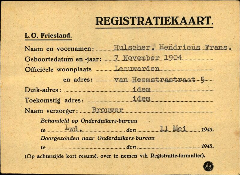 Onderduikregistratie van Hendricus Frans. Hulscher