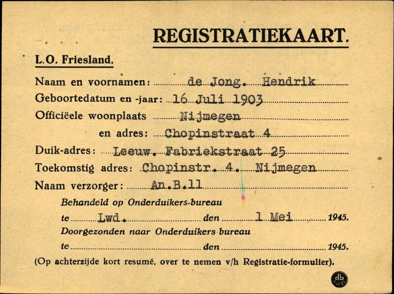 Duikadres: Fabriekstraat 25, Leeuwarden - Oorspronkelijk adres: Chopinstraat 4, Nijmegen - Reden onderduik: anderszins - Overige opmerkingen: Achterkant bijzonderheden: Reden onderduiken: weigeren N.S.B.-liederen te zingen en Joden te vervolgen. - Geen nwe. stkrt. - Achterkant beroep: Opperwachtmeester