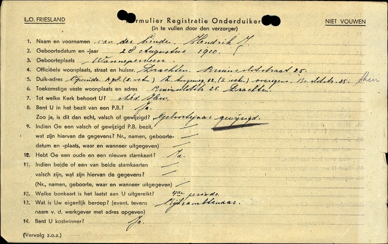 Onderduikinschrijving van Hendrik J. van der Linde