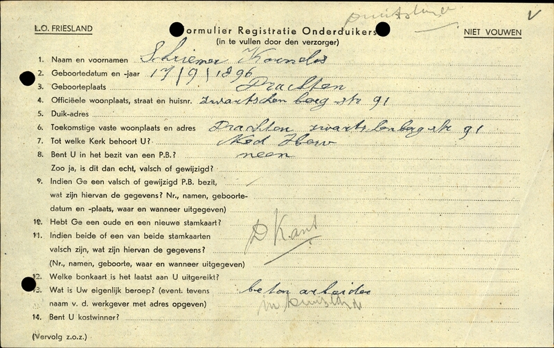 - Oorspronkelijk adres: Schwartzenberghlaan 89, Drachten - Reden onderduik: anderszins - Overige opmerkingen: Bijzondere opmerkingen: Reden onderduiken: ziekte van de Smilde. - Persoonbewijs in de Smilde afgegeven en niet teruggekregen.