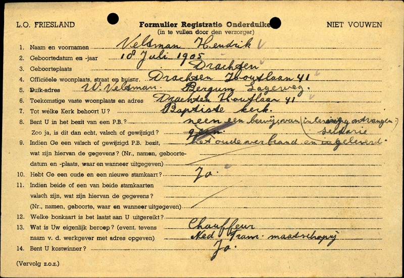 Duikadres: Lageweg, Bergum - Oorspronkelijk adres: Houtlaan 41, Drachten - Reden onderduik: staking - Overige opmerkingen: Bijzondere opmerkingen: bezit geen P.B. een bewijs van inlevering ontvangen sectarie. Het oude verbrand en ingeleverd. Bezit oude en nieuwe stamkaart, is kostwinner en is werkeloos