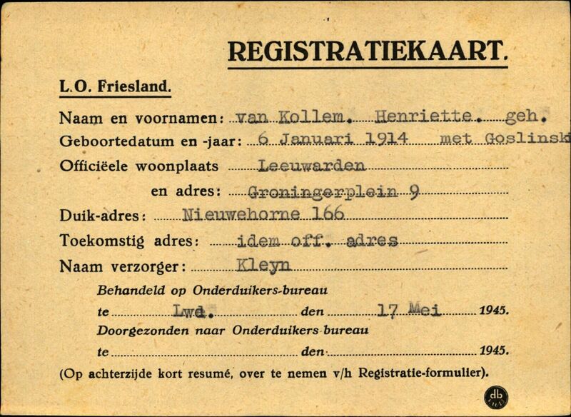 Duikadres: 166, Nieuwehorne - Oorspronkelijk adres: Groningerplein 9, Leeuwarden - Reden onderduik: jodenvervolging - Overige opmerkingen: Achterkant bijzonderheden: Gehuwd met Goslinsk. - Geen stkrt., zijn bij voorm. ondergr. te Heerenveen. - Achterkant beroep: Huisvrouw - Achterkant naam werkgever: -