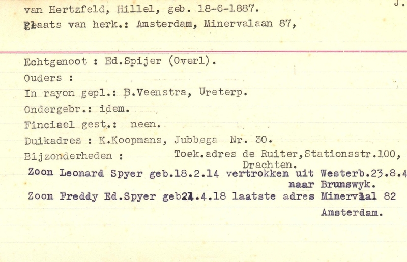 Duikadres: 30, Jubbega - Oorspronkelijk adres: Minervalaan 87, Amsterdam - Overige opmerkingen: Bijzonderheden: Echtgenoot overleden. Toek.adres de Ruiter, Stationsstr.100, Drachten - Zoon Leonard Spyer geb. 18.2.14 vertrokken uit Westerb. 23.8.4@ naar Brunswijk. Zoon Freddy Ed. Spyer geb. 24.4.18 laatste adres Minerv@al 82 Amsterdam.