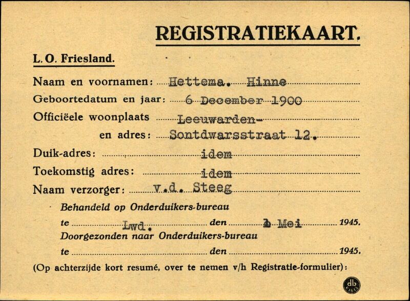 Duikadres: Sontdwarsstraat 12, Leeuwarden - Oorspronkelijk adres: Sontdwarsstraat 12, Leeuwarden - Reden onderduik: arbeidsinzet - Overige opmerkingen: Achterkant beroep: Timmerman