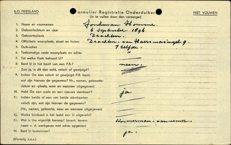 Duikadres: Van Haersmasingel 9, Drachten - Oorspronkelijk adres: Van Haersmasingel 9, Drachten - Reden onderduik: arbeidsinzet - Overige opmerkingen: Bijzondere opmerkingen: met potlood bijgeschreven Smilde