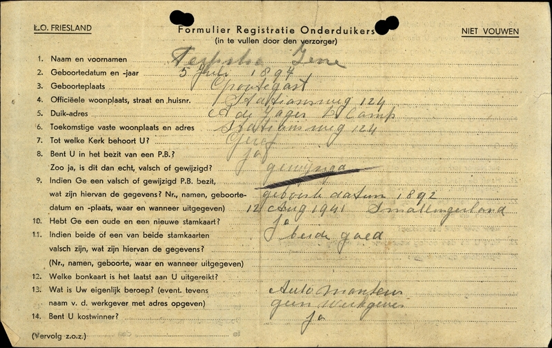 Duikadres: De Kamp - Oorspronkelijk adres: Stationsweg 124, Drachten - Reden onderduik: arbeidsinzet - Overige opmerkingen: Bijzondere opmerkingen: P.B.: Gewijzigd.