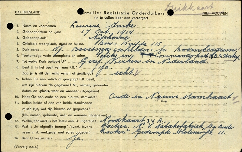 Duikadres: Boornbergum - Oorspronkelijk adres: 115, Benedenknijpe - Reden onderduik: arbeidsinzet - Overige opmerkingen: Bijzondere opmerkingen: Steun L.O. onderduikers f 12 per week. - Beroep Duik-adres: schilder.