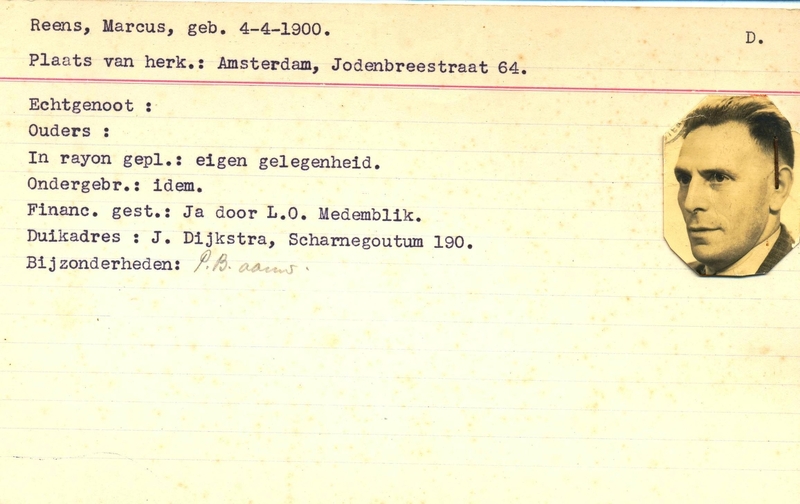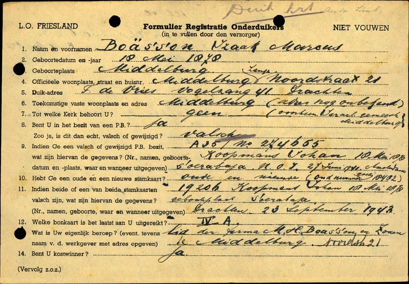 Duikadres: Vogelzang 41, Drachten - Oorspronkelijk adres: Lange Noordstraat 21, Middelburg - Reden onderduik: jodenvervolging - Overige opmerkingen: Bijzondere opmerkingen: Toekomstig adres: Middelburg (adres nog onbekend) - - Valse P.B.: A 35/no. 274655 Koopmans Johan 18 Mei 1878 s'oerabaja. N.O.I 27 Uni 1941 Amsterdam. Valse stamkaart idem gegevens, uitgegeven Drachten 23 September 1943. - Steun ontvangen gedurende het onderduiken van Tante Els: 250 Gld per maand per twee personen tot met 31 Maart '45. - Beslag op bezittingen. - Opm.: drie zoons zijn (volgevoerd ?)