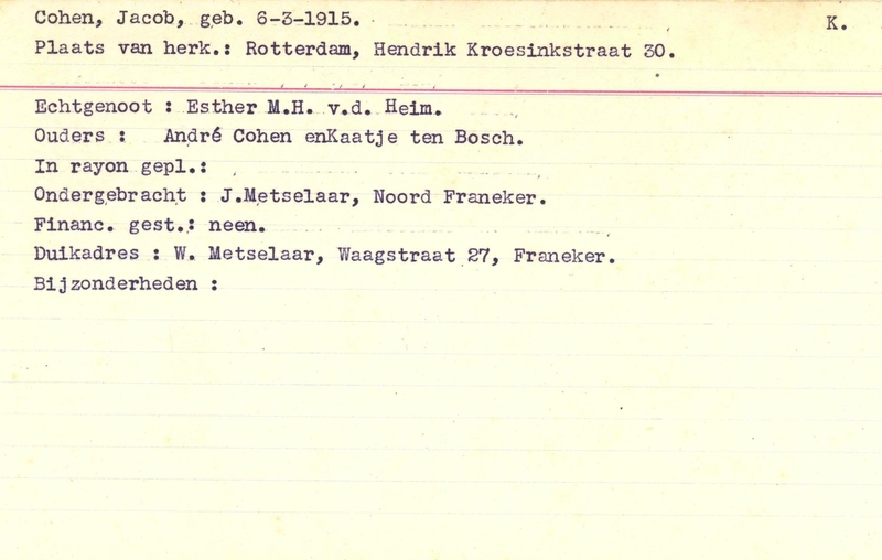 Duikadres: Waagstraat 27, Franeker - Oorspronkelijk adres: Hendrik Croesinckstraat 30, Rotterdam - Overige opmerkingen: Bijzonderheden: Financ. gest.: neen.
