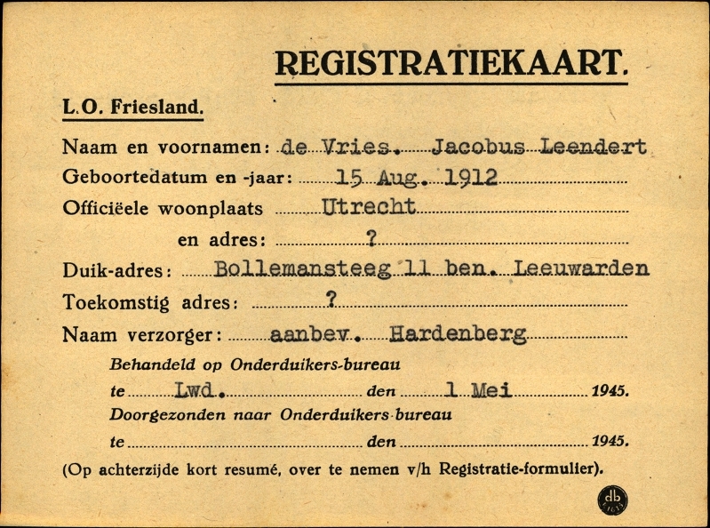 Onderduikregistratie van Jacobus Leendert de Vries