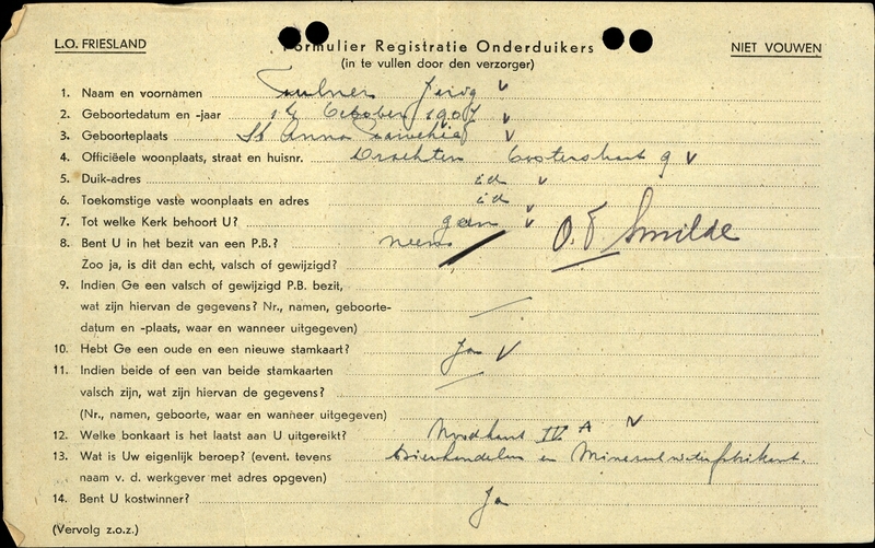 Duikadres: Oosterstraat 9, Drachten - Oorspronkelijk adres: Oosterstraat 9, Drachten - Reden onderduik: arbeidsinzet - Overige opmerkingen: Bijzondere opmerkingen: P.B. neen O.T. Smilde.