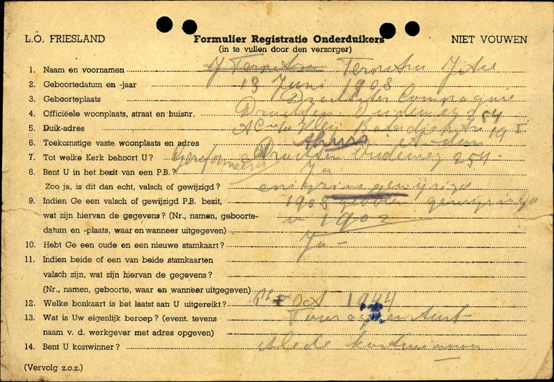 Duikadres: Boterdiepstraat 19 I, Amsterdam - Oorspronkelijk adres: Oudeweg 254, Drachten - Reden onderduik: arbeidsinzet - Overige opmerkingen: Bijzondere opmerkingen: Geboortejaartal gewijzigd op PB van 1908 naar 1902. Laatste bonkaart is gebleven bij fam. in Amsterdam. Vijand heeft drie fietsen meegenomen.