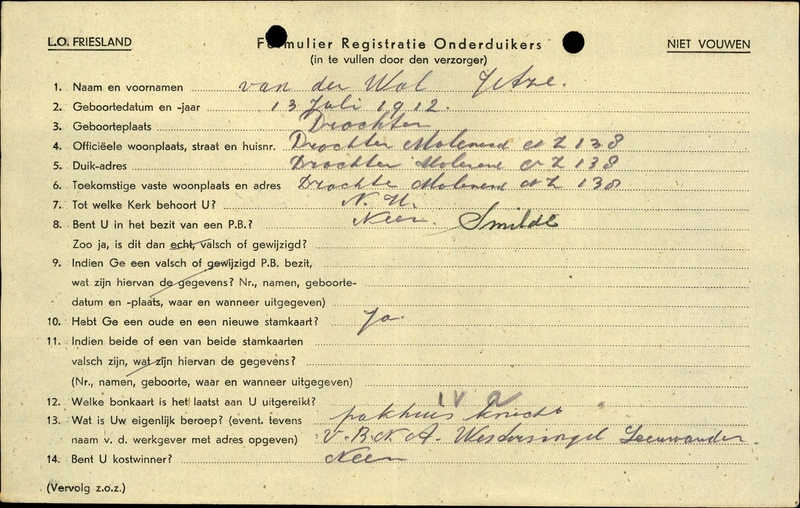 Duikadres: Moleneind Noordzijde 138, Drachten - Oorspronkelijk adres: Moleneind Noordzijde. 138, Drachten - Reden onderduik: arbeidsinzet - Overige opmerkingen: Bijzondere opmerkingen: Bij bezit P.B. en in ander handschrift: "Smilde".