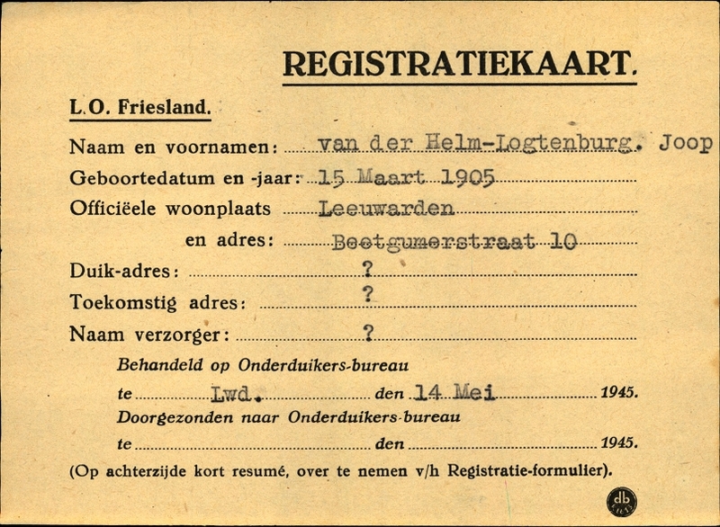 Onderduikregistratie van Joop van der Logtenburg
