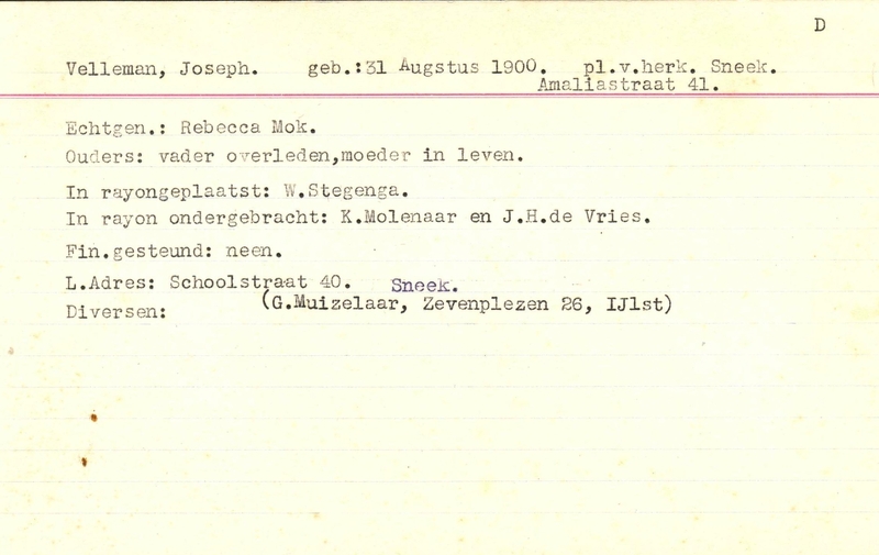 - Oorspronkelijk adres: Amaliastraat 41, Sneek - Overige opmerkingen: Bijzonderheden: Ouders:vader overleden,moeder in leven - Bij l.adres staat Schoolstraat 40 Sneek en tussen haakjes G.Muizelaar.Zevenplezen 26,IJlst.