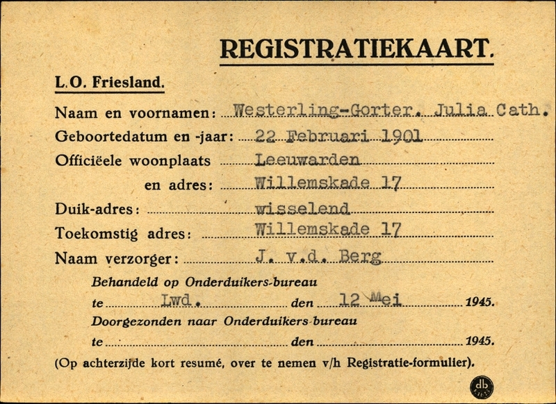 - Oorspronkelijk adres: Willemskade 17, Leeuwarden - Reden onderduik: illegaal werk - Overige opmerkingen: Achterkant bijzonderheden: Gehuwd: Julia Cath. Westerling-Gorter. - - Duik-adres: wisselend. - Toekomstig adres: Willemskade 17 Leeuwarden. - Achterkant beroep: Huisvrouw