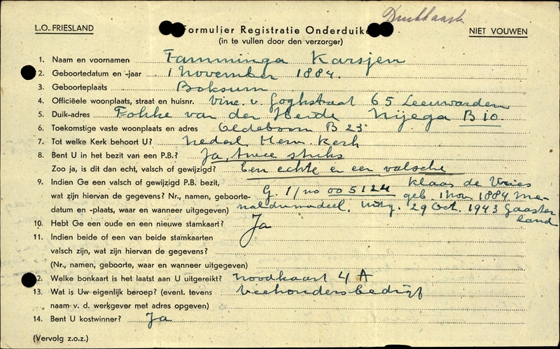 Duikadres: B 10, Nijega (Gem. Smallingerland) - Oorspronkelijk adres: Vincent van Goghstraat 65, Leeuwarden - Reden onderduik: illegaal werk - Overige opmerkingen: Bijzondere opmerkingen: 2 PB's .Ook een valsch. Door de Duitsers gezocht.