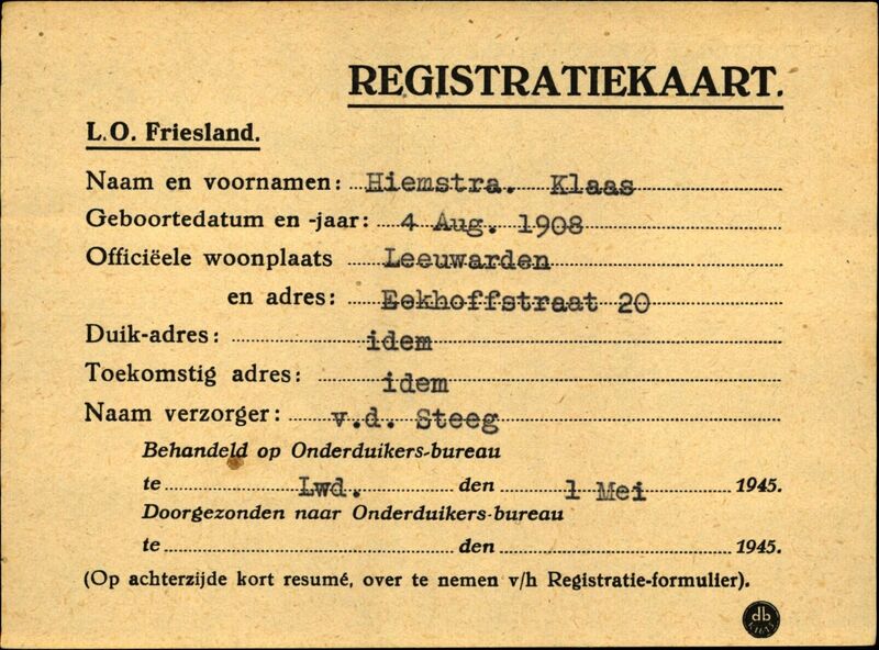 Duikadres: Eekhoffstraat 20, Leeuwarden - Oorspronkelijk adres: Eekhoffstraat 20, Leeuwarden - Reden onderduik: arbeidsinzet - Overige opmerkingen: Achterkant beroep: Colporteur